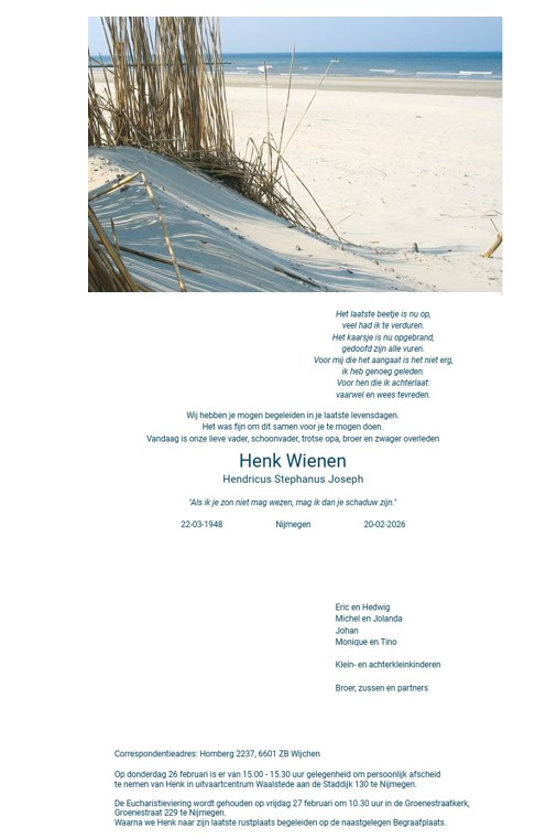 Op 20 februari bereikte ons het nieuws dat Henk Wienen op 77 jarige leeftijd is overleden. Henk was al ruim 30 jaar lid van Juliana en heeft veel betekend voor onze vereniging. Hij is lid van de jeugdcommissie geweest en scheidsrechtercoördinator. In die functie is hij jarenlang betrokken geweest bij het begeleiden van onze jeugdscheidsrechters. Zelf is hij ook lange tijd actief scheidsrechter geweest zowel op het veld als in de zaal. Daarnaast was hij lid van onze clubhuiscommissie en mede verantwoordelijk voor het reilen en zeilen achter de bar. Velen kennen hem natuurlijk ook van de vele bardiensten die hij in onze Stoof heeft gedraaid altijd in zijn vertrouwde trainingspak.